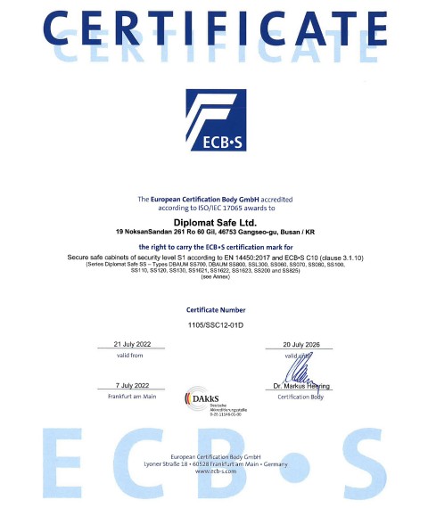 * Please check with the manager for product color availability. There are many options for safes to suit different user needs. Before purchasing a safe, you should determine the expected properties of the product. For example, a safe must be of the highest level of security, fire-resistant, burglar-resistant, or even the last two characteristics combined. Also, do not forget about the size of the structure and the type of lock. The UHL-Mash company offers a wide range of different types of safes and their modifications. What is remarkable about fire-burglar-resistant safes? The metal product has a number of differences from other series of safes. It combines high strength, burglary protection, and will also protect the contents from fire. To achieve effective fire protection, the product design consists of two walls, between which a patented composition of fire-resistant concrete is used. The products undergo a series of strict tests for fire resistance and fire penetration testing. The “Diplomat” series has many certificates that confirm quality: Thanks to the design, the product can withstand temperatures up to 1010 C° for 90-120 minutes. To successfully pass the test, the temperature inside the safe is also checked, which should not exceed 150 C°. What are the advantages of the “Diplomat” series safe: the design has a thermal lock that prevents the passage of fire; the presence of double fastening to the floor (fastening bolts included); protection of the lock and crossbars from knocking out or drilling; system for blocking the locking mechanism in case of burglary; 3-sided deadbolt locking system; burglary resistance: EN 45 011 Class 1; fire resistance level: LFS 90-120P; polymer powder coating. A reliable locking system and the ability to mount the safe into the floor gives the product impressive protection for your documents from unauthorized persons. Also, due to its fire resistance, in case of accidental ignition, the metal will be able to preserve the contents from the flame for a long time. Polymer powder paint is environmentally friendly and does not emit toxic substances at high temperatures or heating like regular paint. If you have questions about this model or other questions that arise, please ask the managers of the UHL-MASH company by filling out the feedback form.