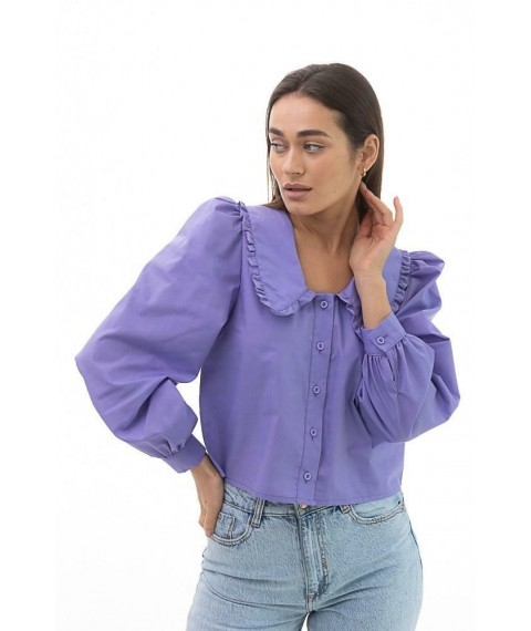 Даже классические деловые образы могут выглядеть стильно и оригинально, если вместо сиреневой женской рубашки вы наденете эту молодежную укороченную блузку с акцентным воротником. У модели низ прямой, длинные рукава-фонарики заканчиваются узкой манжетой на пуговке. Круглая горловина обшита отложным воротником, края которого декорированы мелкой оборкой. Застегивается эта модная блузка спереди на ряд пуговиц. Такая новинка от "Аржен" станет базой для самых разных ваших образов, скорее заказывайте и будьте в тренде в новом сезоне!
