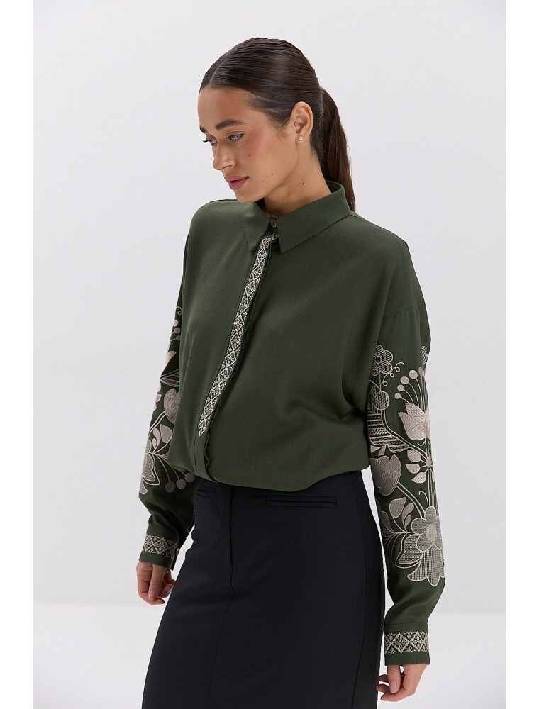 Оригинальная женская вышиванка тёмно-зелёного цвета с золотистой цветочной и геометрической вышивкой от бренда ARJEN. Круглая горловина с воротником-стойкой, длинные рукава с манжетами на пуговицах, застёжка — пуговицы спереди. Машинная вышивка гладью и крестиком.