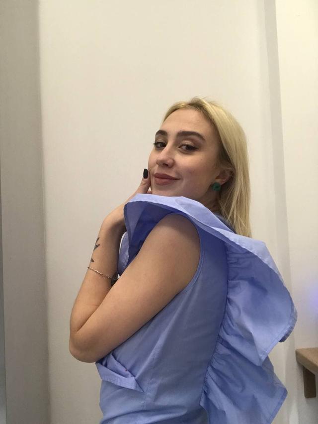 Блуза женская голубая базовая коттоновая дизайнерская с воланами MKAD7494-02