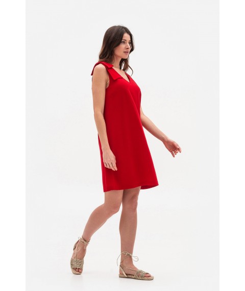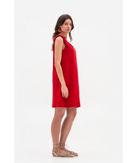 Червоний лляний міні-сарафан трапецієподібного силуету стане ефектним акцентом вашого літнього образу. V-подібні вирізи спереду та ззаду додають елегантності. Оригінальною деталлю моделі є декоративний бант з основної тканини з одного боку, що надає сарафану особливого шарму.
