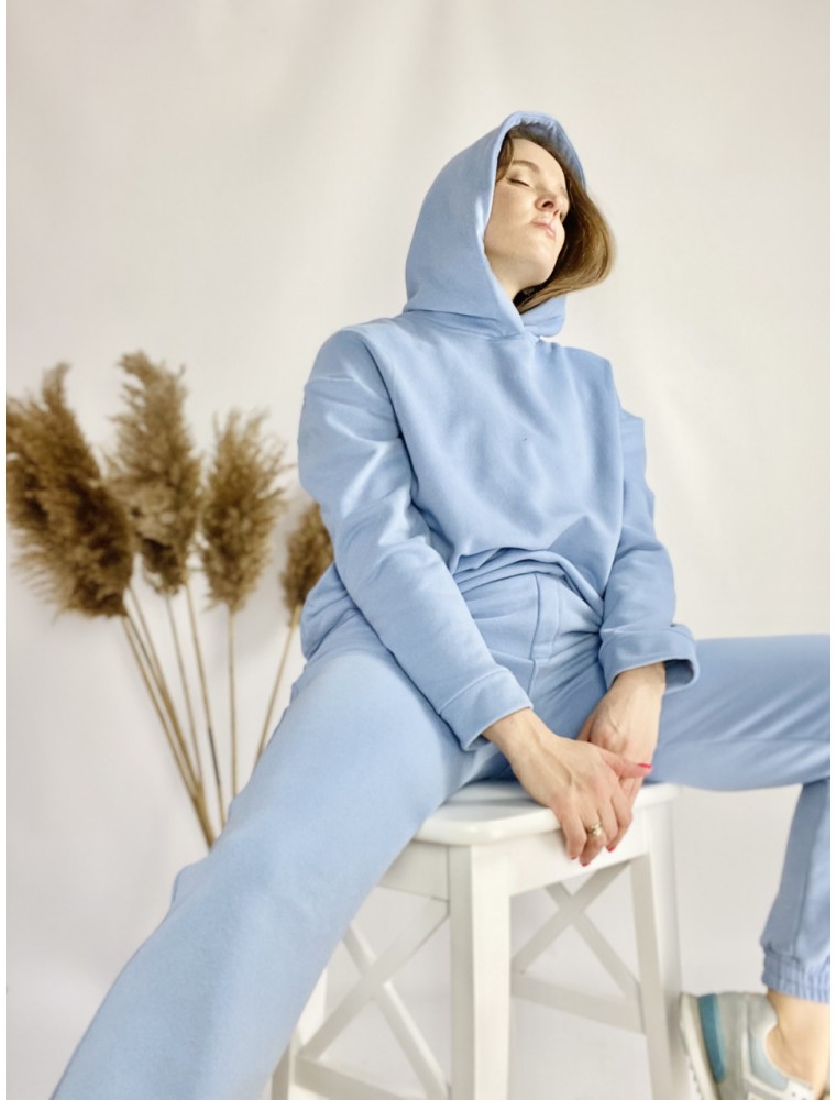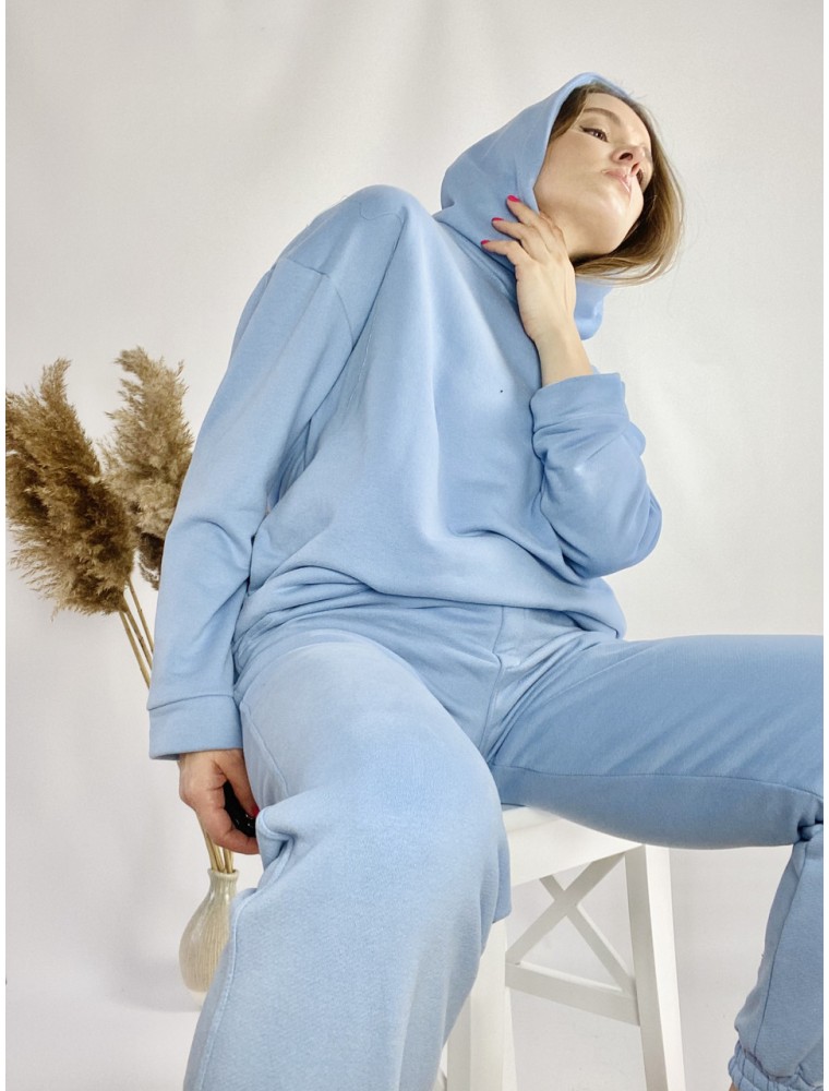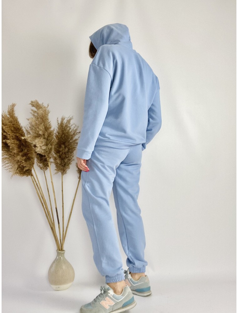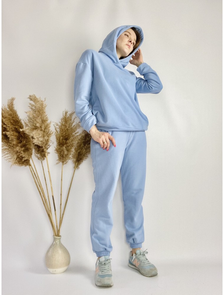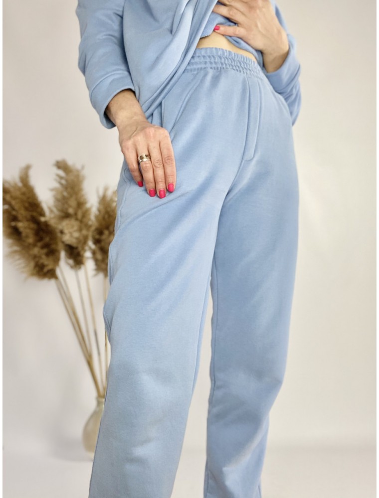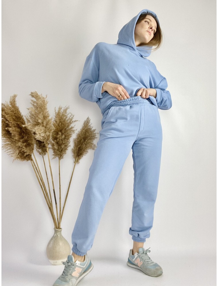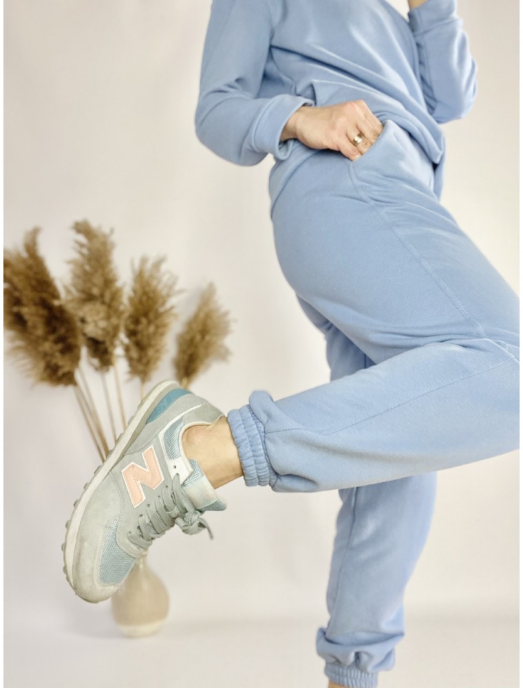 Спортивные женские штаны-джогеры голубые с манжетами внизу. Высокая посадка модели этих спортивных штанов прекрасно сочетается с любыми кофтами, топами и рубашками. Но, также, вы можете купить в интерет-магазине костюм с даной моделью женских спортивных брюк, подобрав себе худи,реглан или свитшот.
