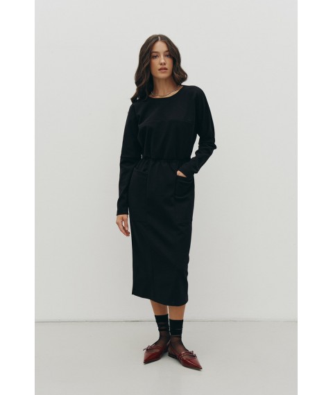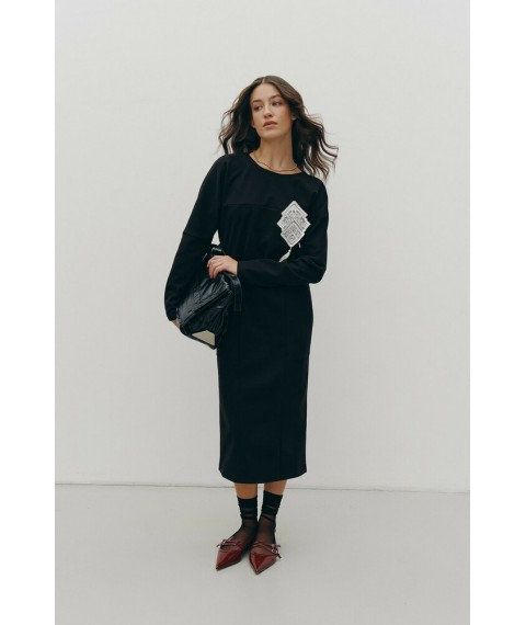 Теплое платье миди с брошью черное Rica Mare MKRM4217-1 42 46