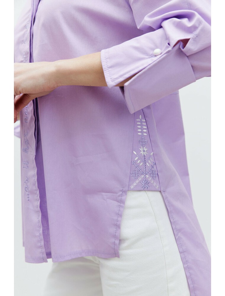 Рубашка в очень красивом сиреневом цвете выполнена из натуральной ткани и имеет декоративную фразу вдоль застежки и вышивку по бокам рядом с разрезами. Воротник рубашки имеет стойку. Манжеты украшены бисером, который стильно застегивается в виде манжетной пуговицы. Комбинируется с разнообразной обувью и разными стилями одежды.